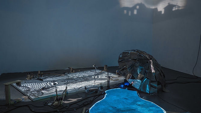 Gardening the Ruins is an installation of projected images, sound, robotics, and drawings on canvas that depicts a future garden space. In thinking about the history of gardens as quiet, secluded, and delightful places to heal both body and mind, Zhong developed an alternative model of what a garden of the future might look like. This space is both meditative and beautiful, while at the same time brutal and mechanical, devoid of actual organic elements. Land, water, human bodies and movements, architecture, and oceans are replicated by Zhong using artificial materials, with handmade robotic farming tools. These machines work the ‘land’ of the artificial garden in their repeated motions moving back and forth and, over time, changing the surface and composition of the canvases that represent the terrain. The work imagines what a natural landscape looks like in a world that is increasingly hybridized between the natural and the technological.